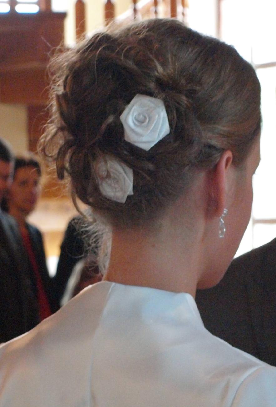 Co do samej fryzury, to moje założenie było takie - włosy muszą być upięte, a całość ma wytrzymać aż do końca poprawin (nie wybierałam sobie jakieś konkretnej fryzury, ani też nie byłam na "próbnym uczesaniu" - dla mnie to trochę śmieszne - lepiej iść na całego,  a co ma być, to będzie:). Zależało mi też na wpięciu we włosy widocznych na zdjęciach, białych kwiatków... A dlaczego? Sami znajdziecie odpowiedź na to pytanie, kiedy ujrzycie suknię :) Do upięcia włosów zużyto (uwaga!) aż 50 wsuwek (!!!) i do dziś zastanawiam się, jak mi się one na tej głowie zmieściły i praktycznie nie były widoczne :) Koszt fryzjera - 30 zł. Zadowolenie - bezcenne :)