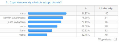 Zaskoczyły mnie nieco odpowiedzi, których udzieliliście na pytanie numer 8. Szczerze przyznam, że na drugiem miejscu spodziewałam się odpowiedzi "marka". Okazało się jednak, że w trakcie zakupu obuwia kierujecie się przede wszystkim jego ceną i komfortem użytkowania. Moim zdaniem, to bardzo mądre podejście :)