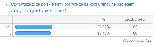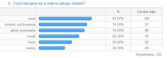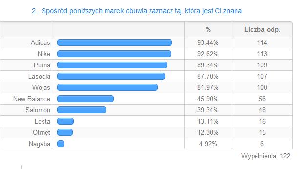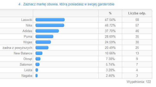 Nie ukrywam, że moim faworytem w przypadku pytania dotyczącego popularności firm produkujących obuwie była marka NIKE. Jednym głosem jednak zwyciężył ADIDAS. Bardzo wysoko uplasowała się firma LASOCKI, którą znajomość potwierdziło 107 ze 122 badanych. Myślałam, że bardziej popularna jest Lesta czy Nagaba, ale jej znajomość wśród ankietowanych wyniosła zaledwie kilka procent. Znowu króluje Zachód :)
